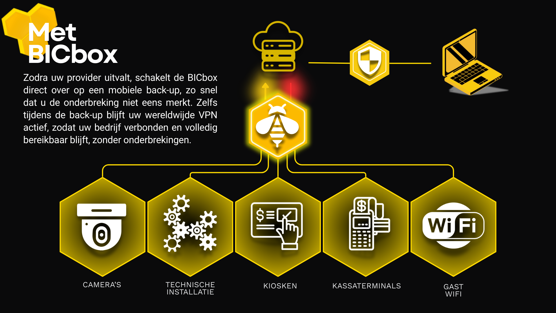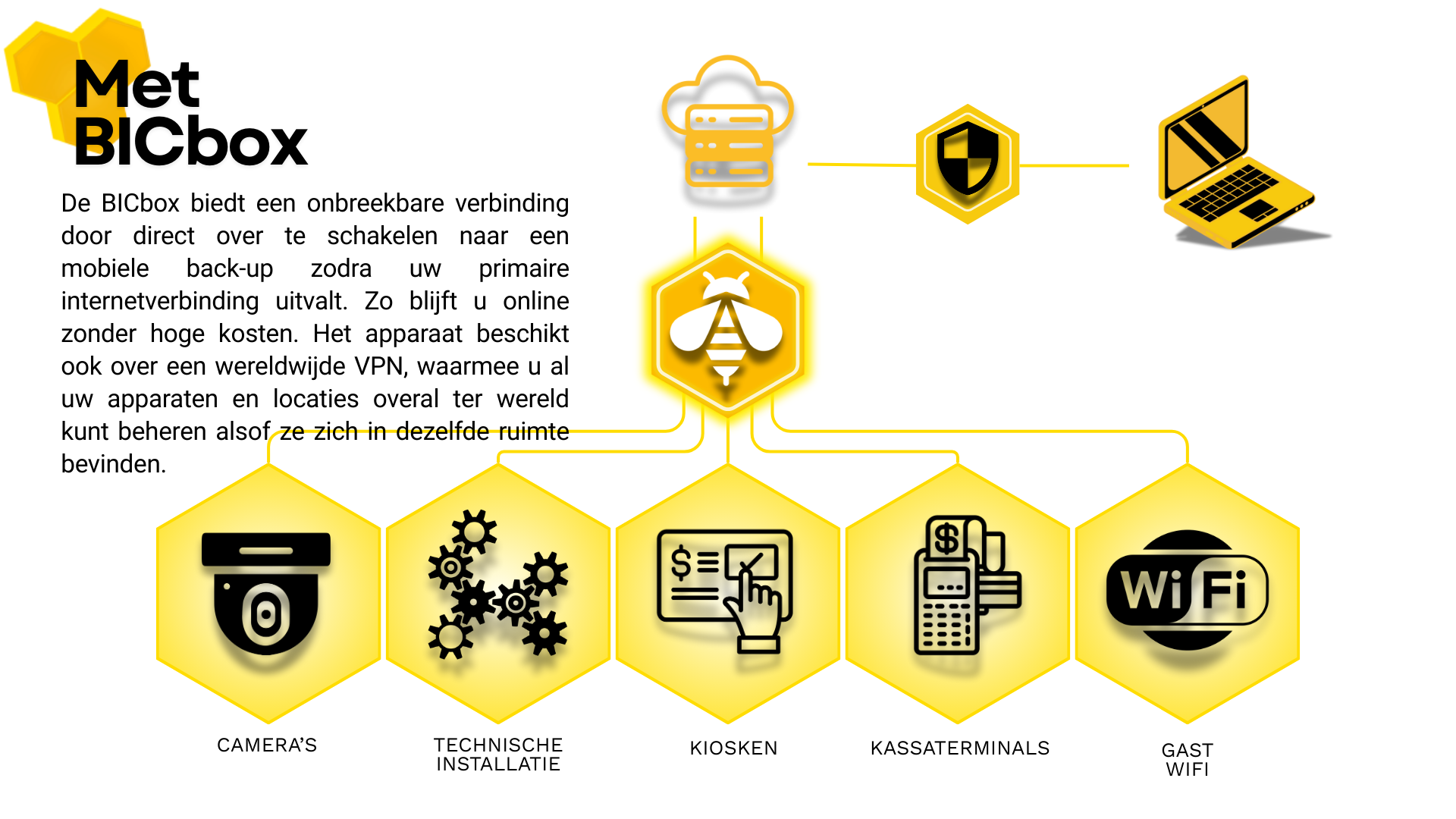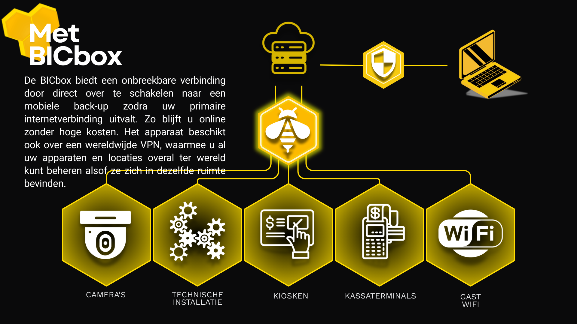 Toegang tot alle faciliteiten die je gewend bent, veilig uit te breiden naar elke locatie met de BICbox. De BICbox zorgt ervoor dat je altijd online bent.
